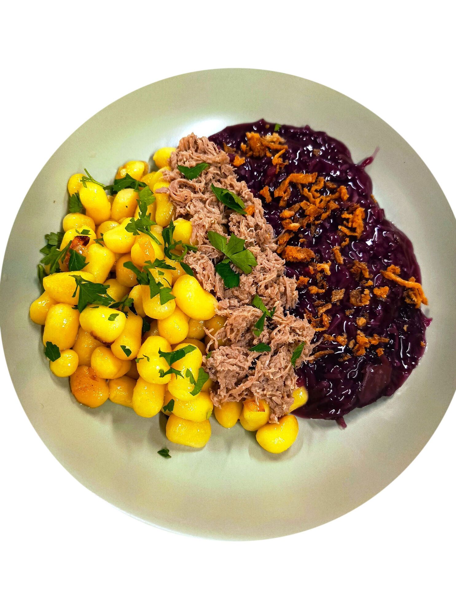 * velká základní porce (min. 350 g) ! / SPECIALITA sezóny / čerstvé premio mini bramborové nočky s trhaným kachním masem sous-vide a dušeným červeným zelím a restovanou cibulkou / olivový olej, sůl, pepř. 1,7 / Používáme 100% kompostovatelné BIO obaly! Jsme ECO FRIENDLY!