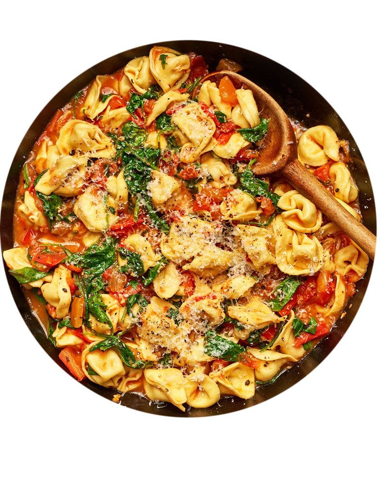 plněné čtyřmi druhy sýrů ve smetanové omáčce s listovým špenátem a sicilských sušených rajčátek a zapečené sýrem Mozzarella